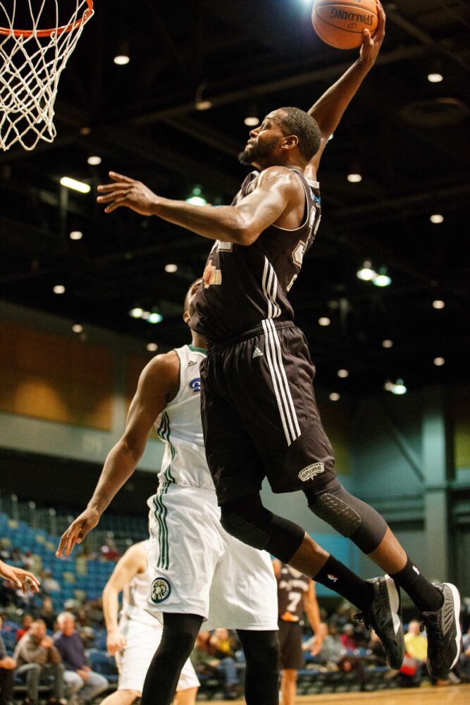 Austin Spur JAMYCHAL GREEN (32) throws down a monster dunk during the NBA D-League Basketball game between the Reno Bighorns and the Austin Spurs at the Reno Events Center in Reno, Nevada.