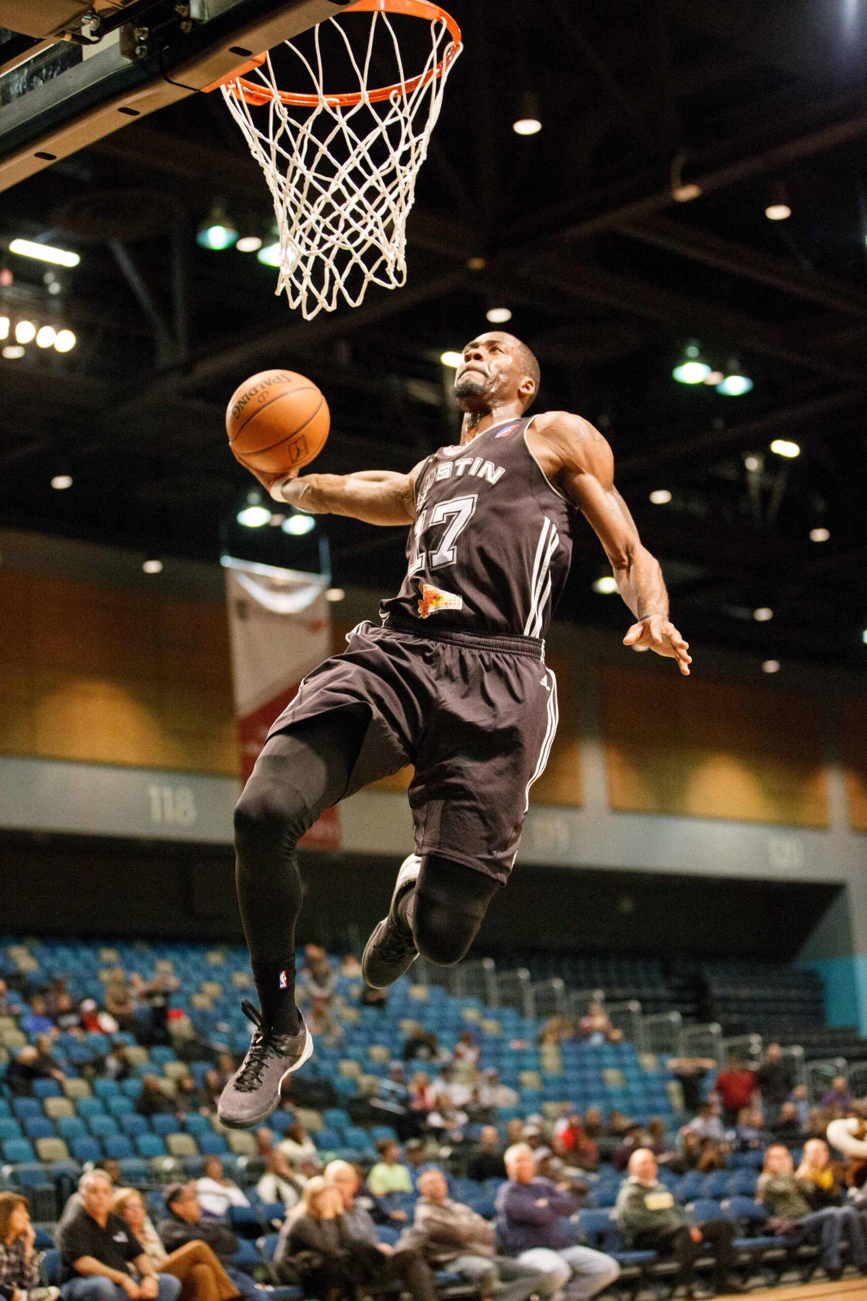 Austin Spur JONATHAN SIMMONS (17) shows a little flair during the NBA D-League Basketball game between the Reno Bighorns and the Austin Spurs at the Reno Events Center in Reno, Nevada.