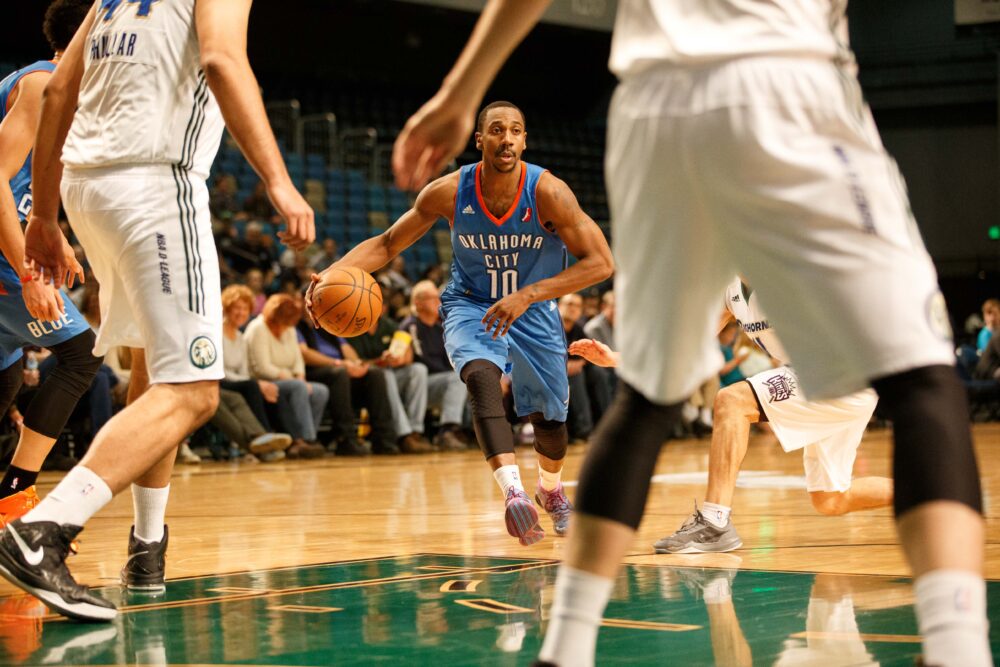 Always looking for a teammate with the best shot, Oklahoma City Blue MARQUIS TEAGUE (10) during the NBA D-League Basketball game between the Reno Bighorns and the Oklahoma City Blue at the Reno Events Center in Reno, Nevada.
