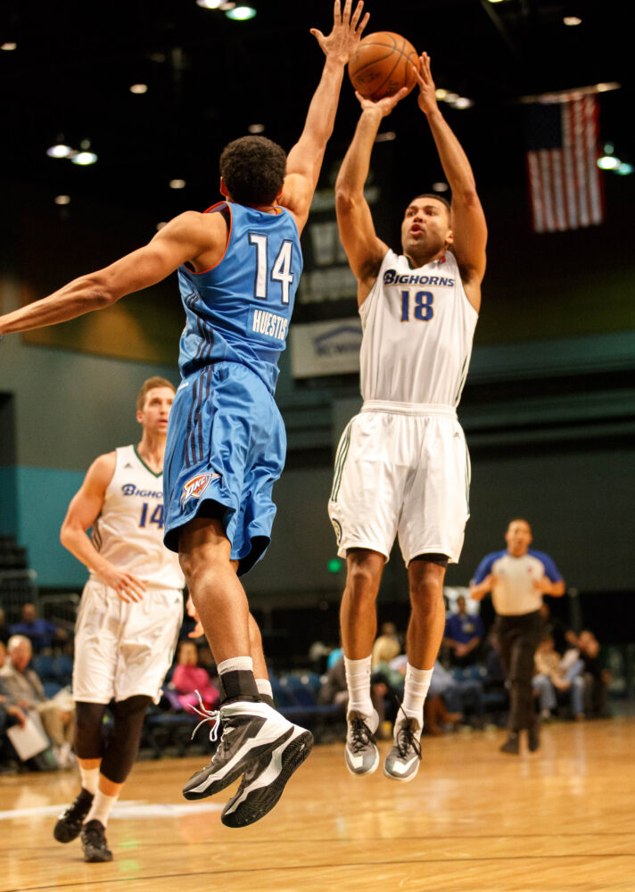 Reno Bighorn CAMERON AYERS (18) shoots a three over the hands of Oklahoma City Blue JOSH HUESTIS (14) during the NBA D-League Basketball game between the Reno Bighorns and the Oklahoma City Blue at the Reno Events Center in Reno, Nevada.