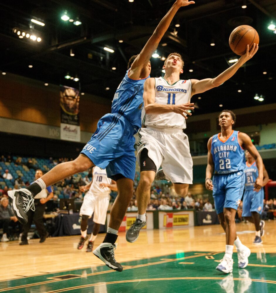 Super quick and crafty Reno Bighorn Guard DAVID STOCKTON (11) elevates in the key against Oklahoma City Blue Big Man MAURICE SUTTON JR (24) during the NBA D-League Basketball game between the Reno Bighorns and the Oklahoma City Blue at the Reno Events Center in Reno, Nevada.