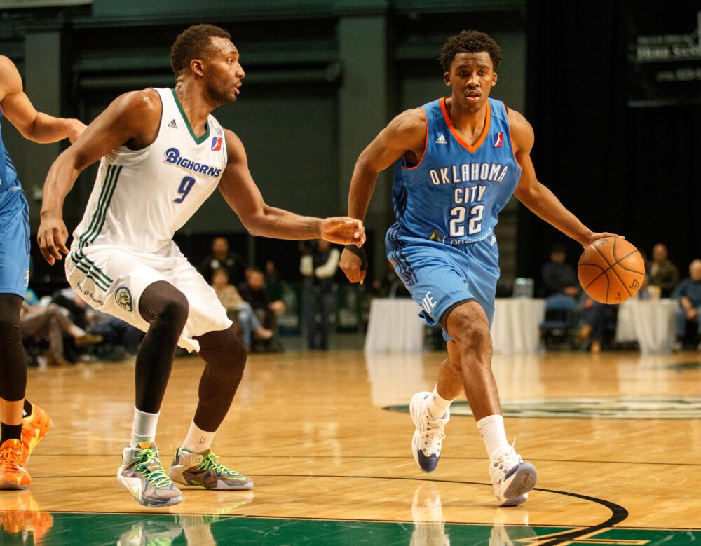 NBA D-League All Star Selections JORDAN HAMILTON (9) (RNO) and SEMAJ CHRISTON (22) (OKC) during the NBA D-League Basketball game between the Reno Bighorns and the Oklahoma City Blue at the Reno Events Center in Reno, Nevada.