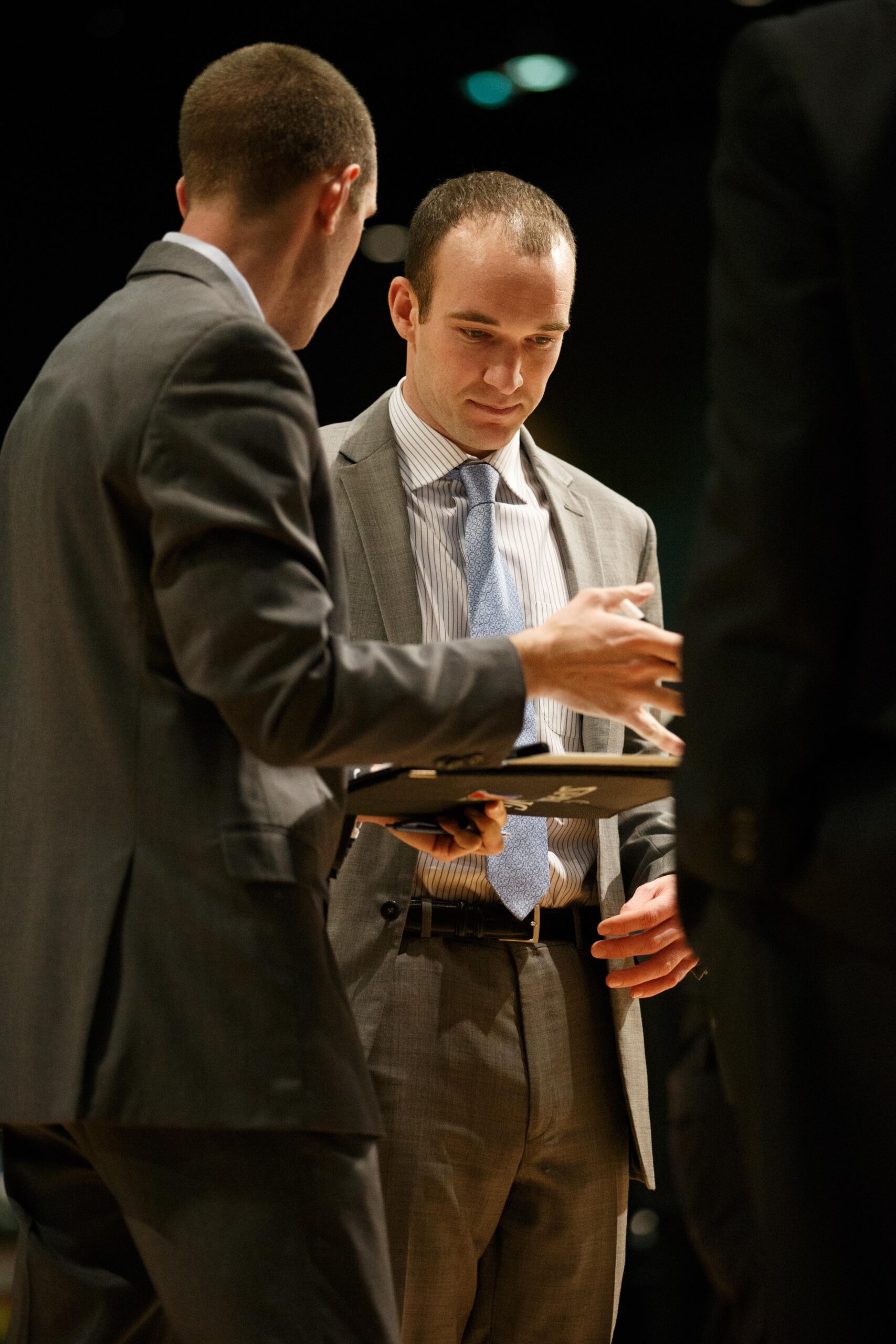 Reno Bighorn Coach DAVID ARSENEAULT receives counsel from Assistant Coach Ross McMains during the NBA D-League Basketball game between the Reno Bighorns and the Santa Cruz Warriors at the Reno Events Center in Reno, Nevada. Reno set a new NBA D-League record with 31 three point shots made in a single game.