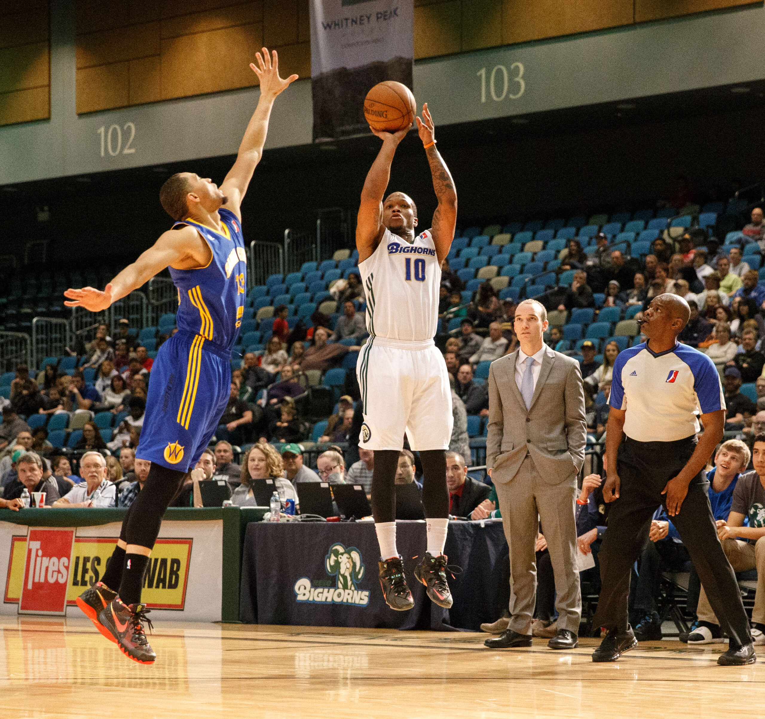 Reno Bighorn RAĆSHAD JAMES (10) shoots for three during the NBA D-League Basketball game between the Reno Bighorns and the Santa Cruz Warriors at the Reno Events Center in Reno, Nevada. Reno set a new NBA D-League record with 31 three point shots made in a single game.