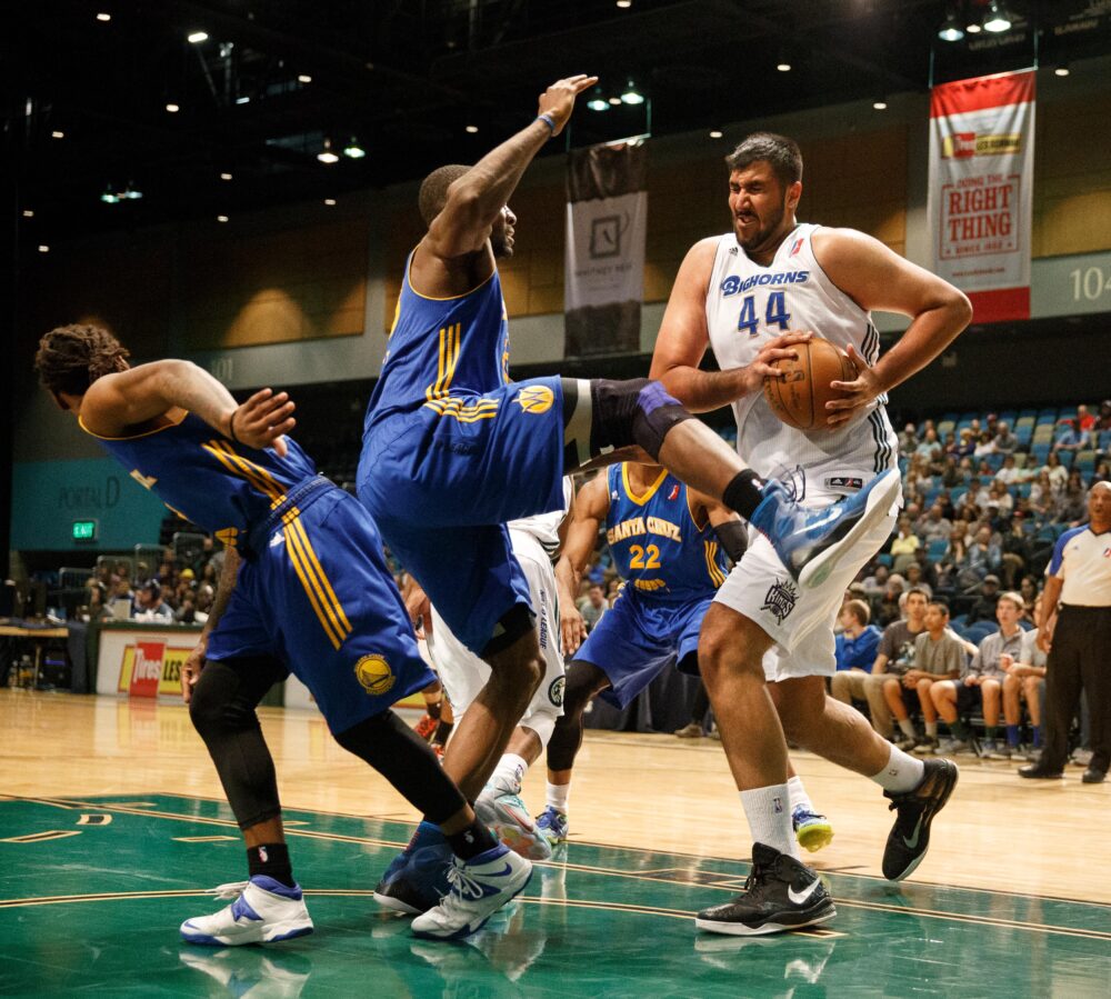 With bodies flying, Reno Bighorn Center SIM BHULLAR (44) attempts to take it to the hoop against Santa Cruz Warrior FESTUS EZELI (33) during the NBA D-League Basketball game between the Reno Bighorns and the Santa Cruz Warriors at the Reno Events Center in Reno, Nevada. Reno set a new NBA D-League record with 31 three point shots made in a single game.