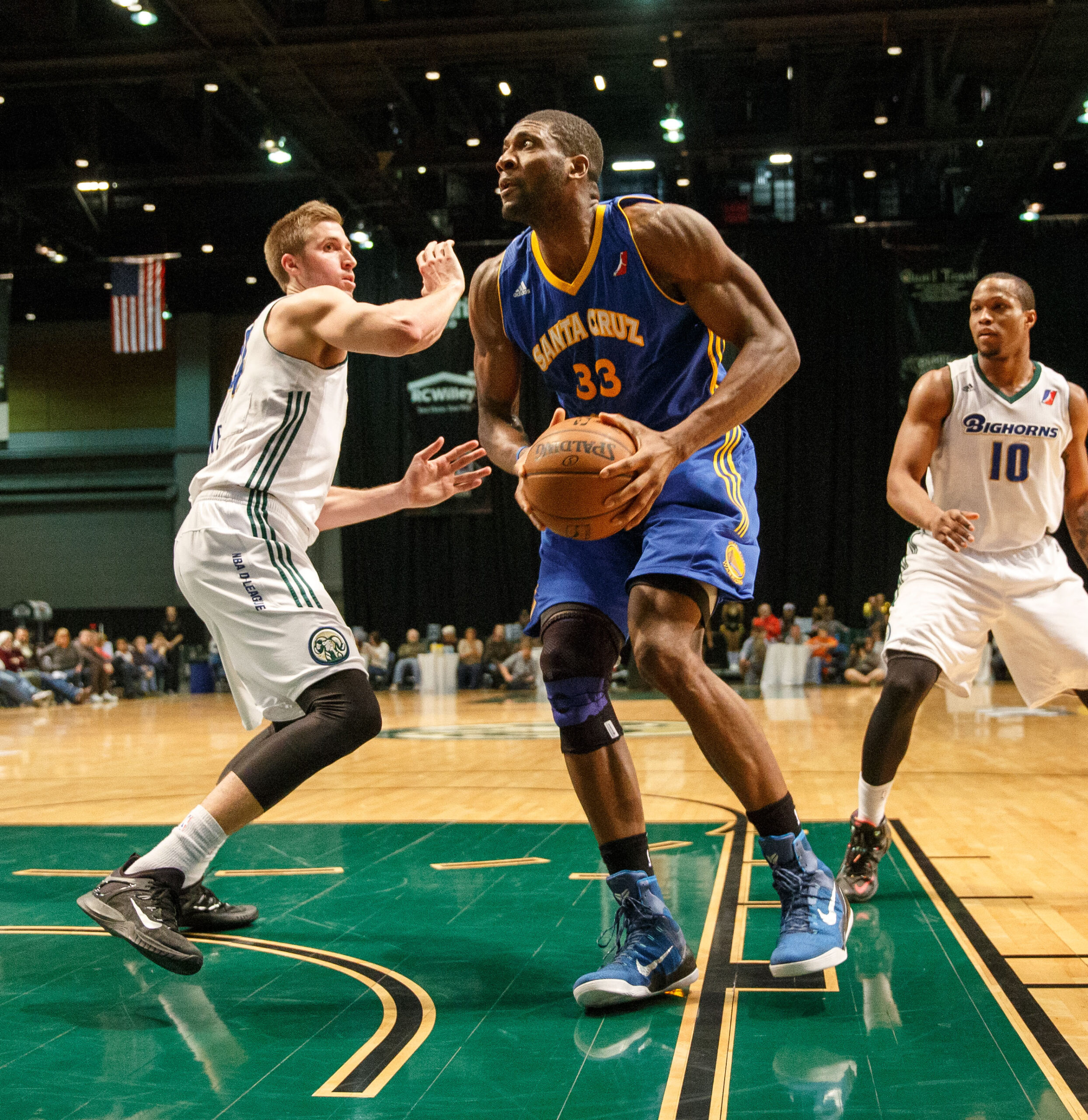 Santa Cruz Warrior FESTUS EZELI (33) makes his move under the hoop against Reno Bighorn DAVID WEAR (14) during the NBA D-League Basketball game between the Reno Bighorns and the Santa Cruz Warriors at the Reno Events Center in Reno, Nevada. Reno set a new NBA D-League record with 31 three point shots made in a single game.