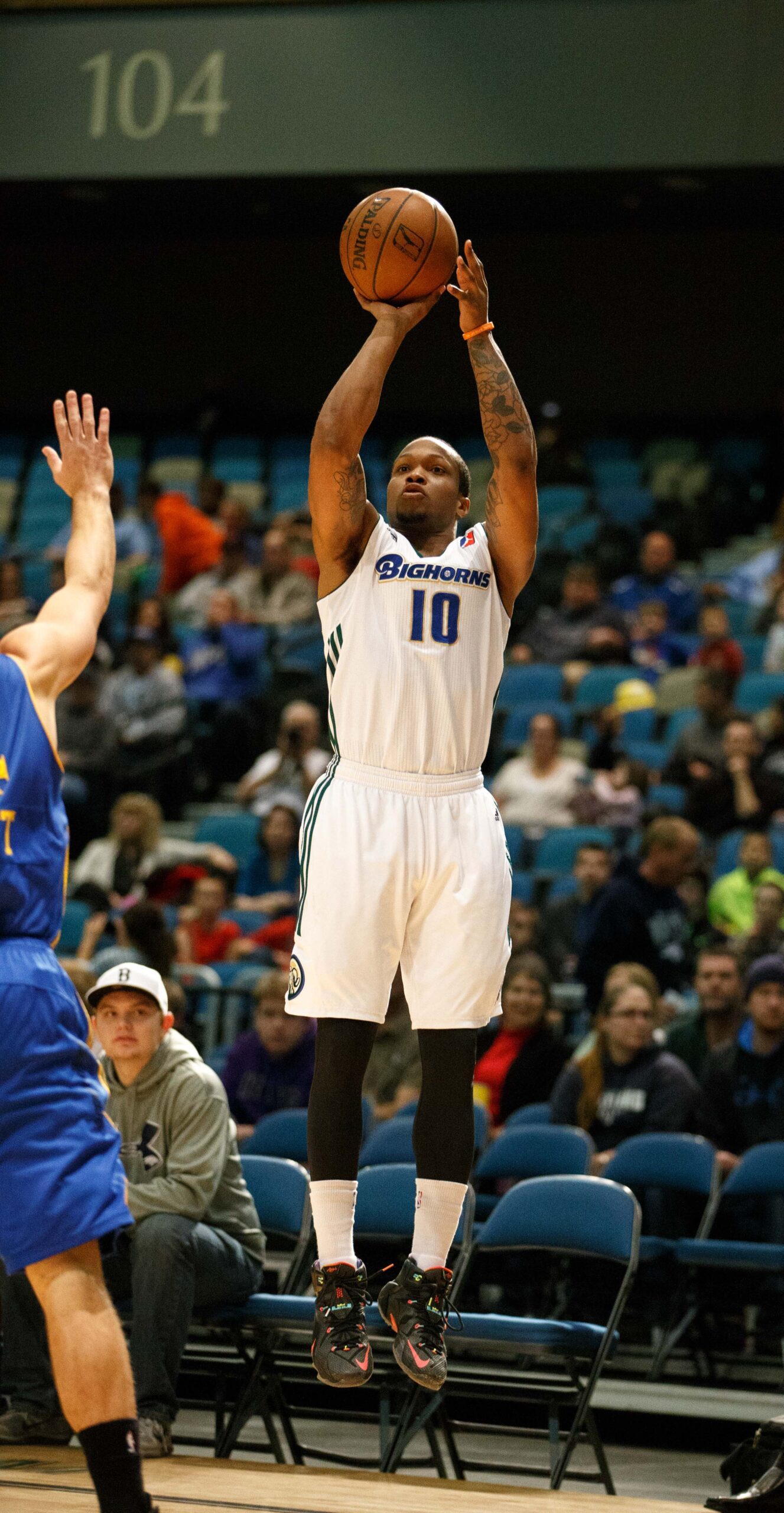 Reno Bighorn RAĆSHAD JAMES (10) shoots for three during the NBA D-League Basketball game between the Reno Bighorns and the Santa Cruz Warriors at the Reno Events Center in Reno, Nevada. Reno set a new NBA D-League record with 31 three point shots made in a single game.