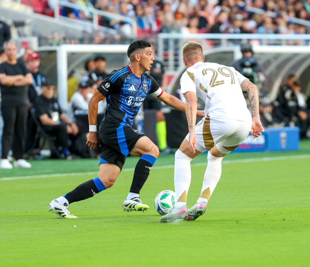 San Jose Earthquakes Midfielder CRISTIAN ESPINOZA (10) cuts back against Los Angeles FC Defender ARTEM SMOLIAKOV (29) during the MLS match between the San Jose Earthquakes and Los Angeles FC at Levi’s Stadium in Santa Clara, California