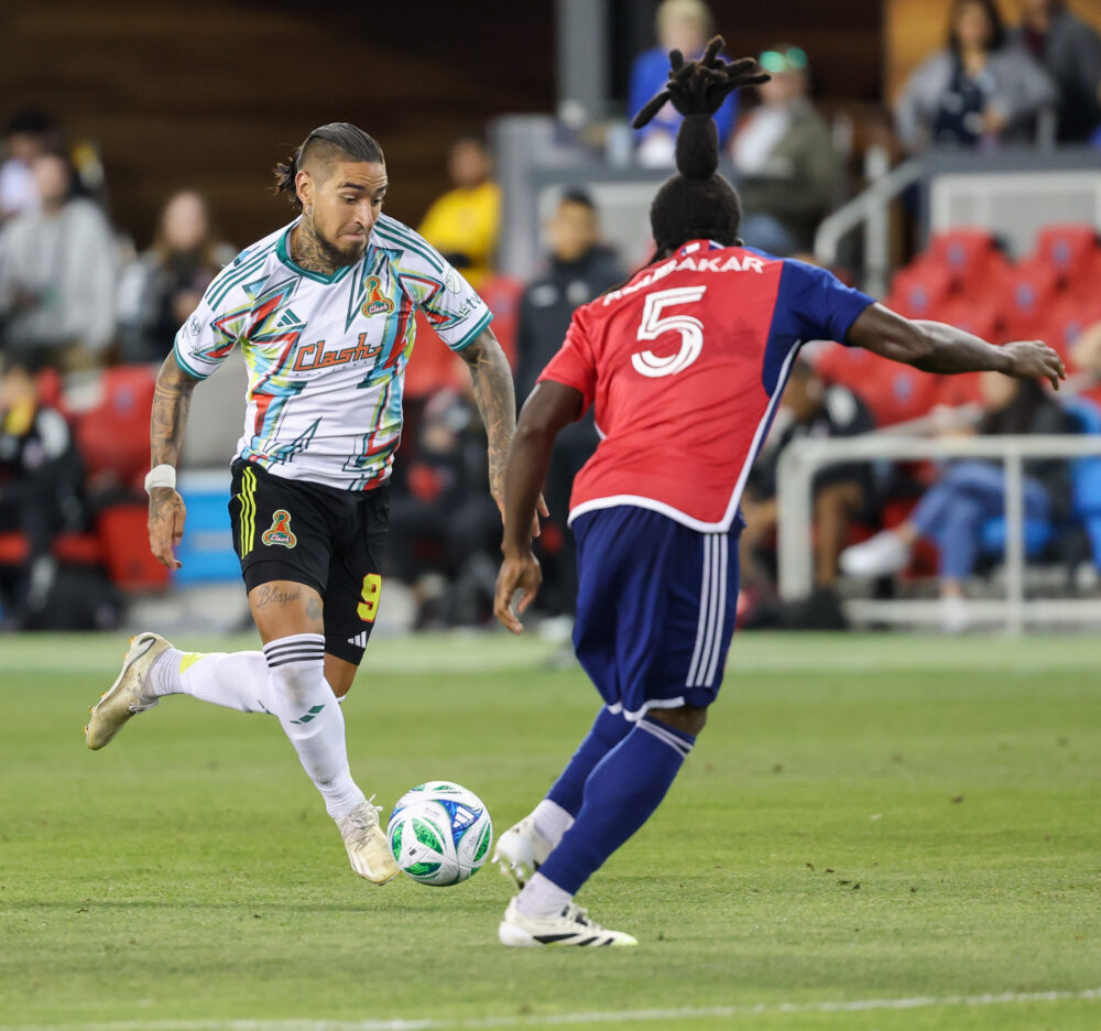San Jose Earthquakes Forward CHICHO ARANGO (9) dribbles against FC Dallas Defender LALAS ABUBAKAR (5) during the MLS match between the San Jose Earthquakes and FC Dallas at PayPal Park in San Jose, California