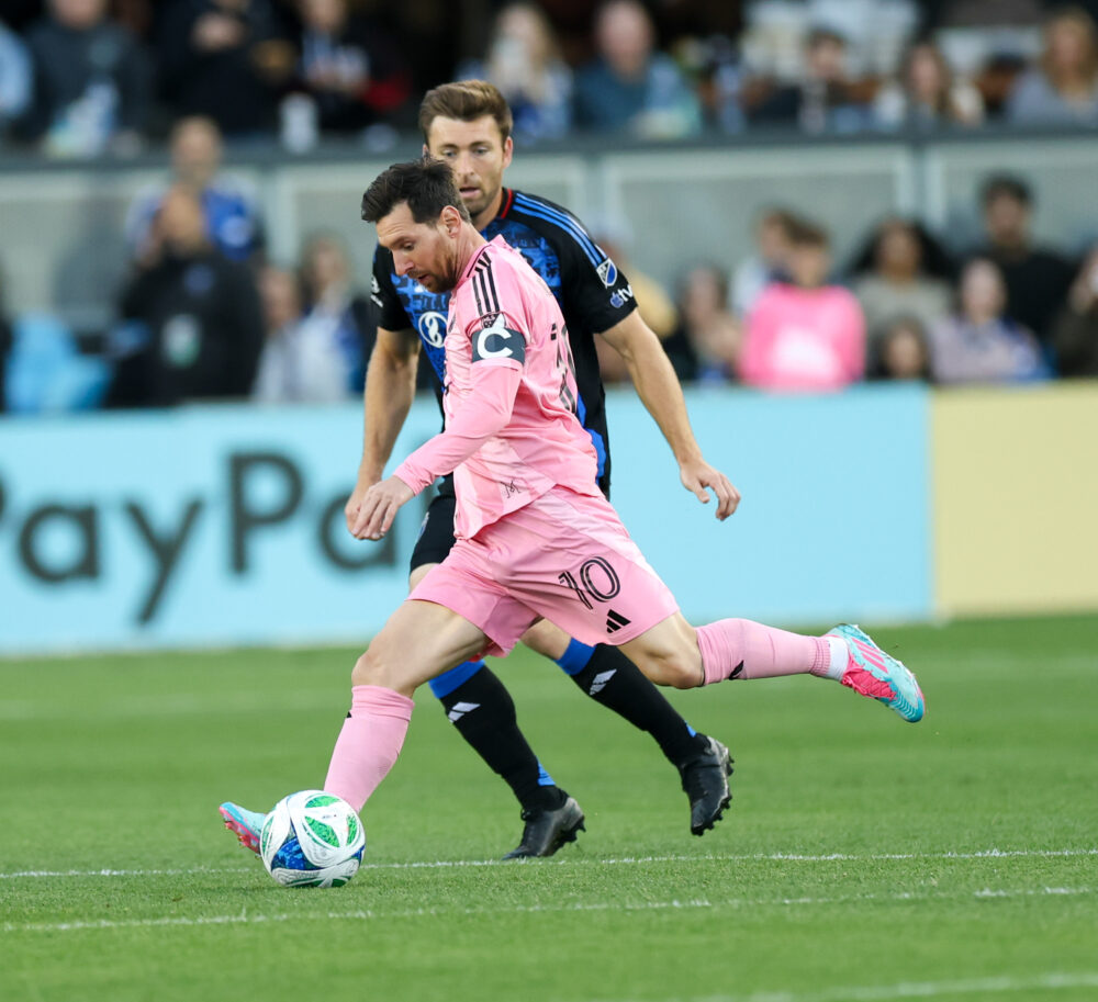 Inter Miami CF Forward LIONEL MESSI (10) passes the ball under pressure from San Jose Earthquakes Defender DAVE ROMNEY(12) during the MLS match between the San Jose Earthquakes and Inter Miami at PayPal Park in San Jose, California