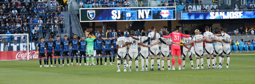 The San Jose Earthquakes and New York Red Bull starting eleven gather for a moment of silence before the MLS match between the San Jose Earthquakes and New York Red Bull at PayPal Park in San Jose, California