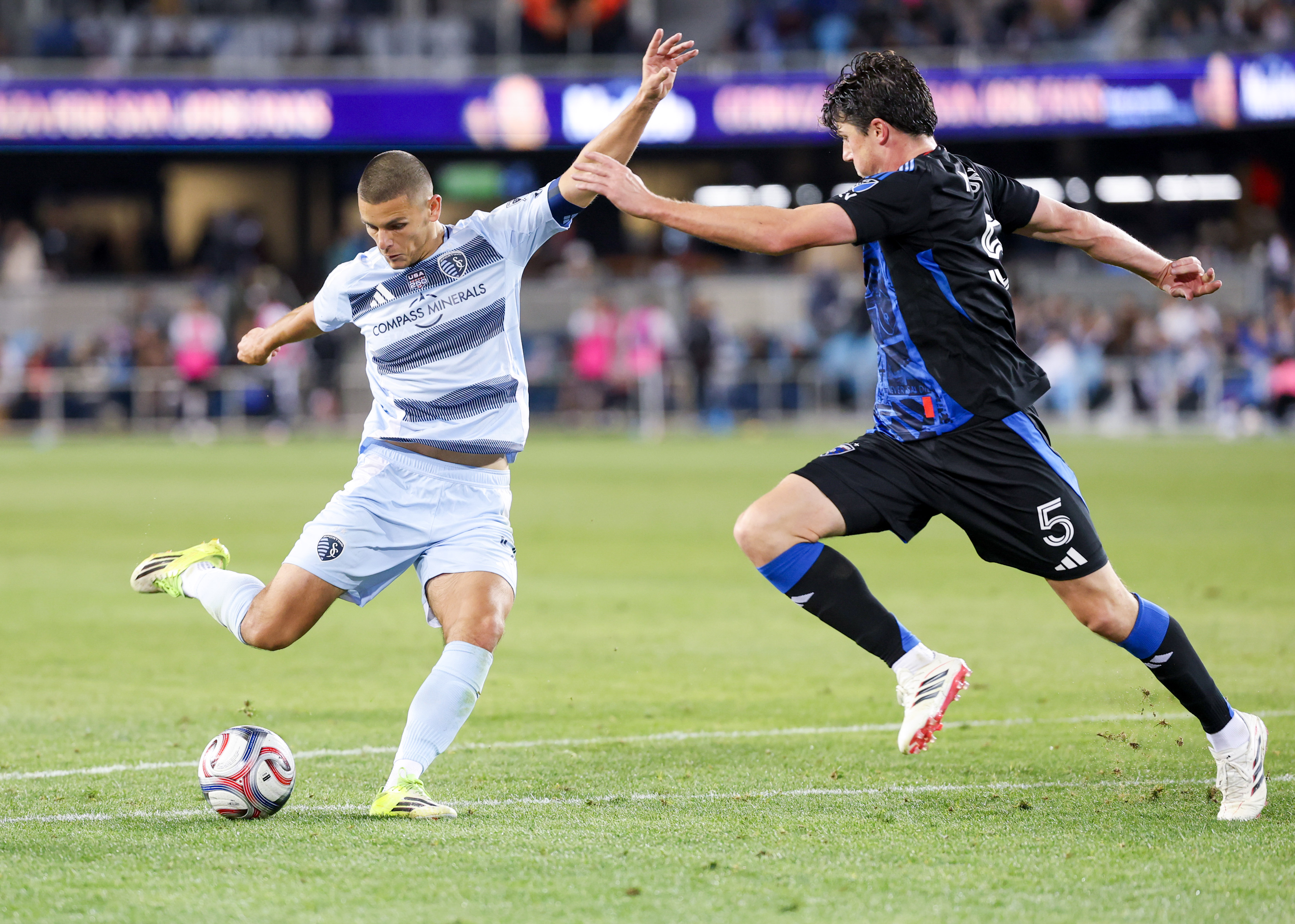 Sporting Kansas City Forward DEJAN JOVELIJIĆ (9) shoots under pressure from San Jose Earthquakes Defender DANIEL MUNIE (5) during the MLS match between the San Jose Earthquakes and Sporting Kansas City at PayPal Park in San Jose, California