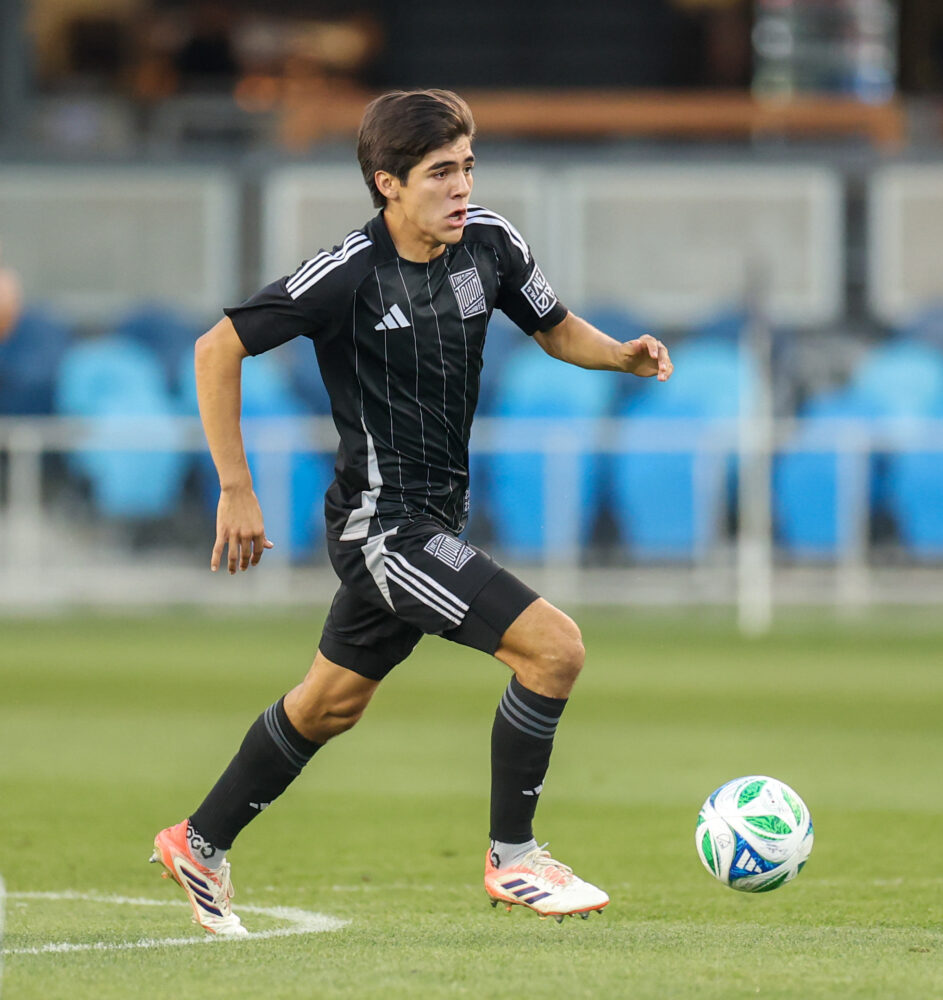 The Town FC Midfielder EDWYN MENDOZA (38) drives the ball upfield during the MLS NEXT PRO match between The Town FC and North Texas SC at PayPal Park in San Jose, California