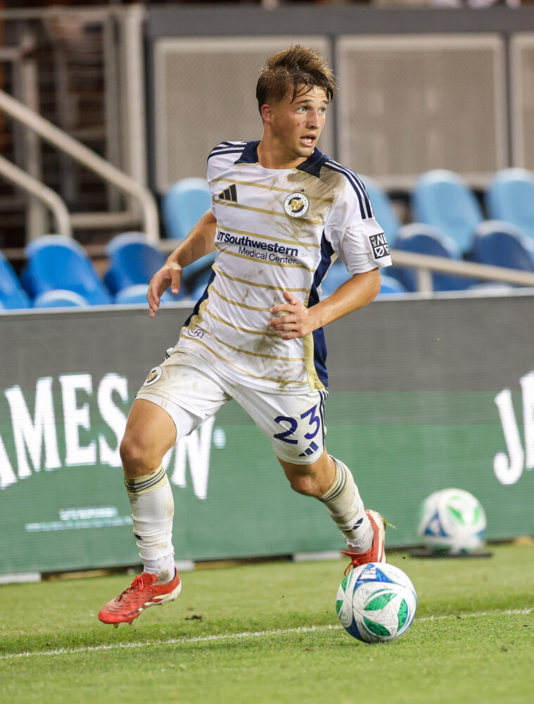 North Texas SC Midfielder CALEB SWANN (23) looks for a teammate during the MLS NEXT PRO match between The Town FC and North Texas SC at PayPal Park in San Jose, California