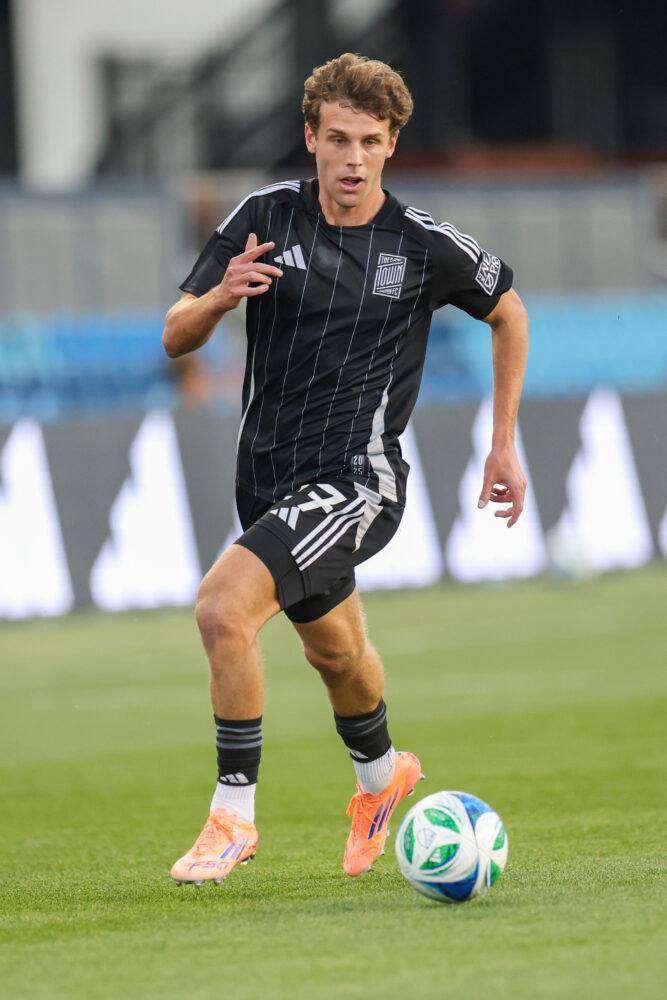 The Town FC Defender WILSON EISNER (27) looks for a teammate during the MLS NEXT PRO match between The Town FC and North Texas SC at PayPal Park in San Jose, California