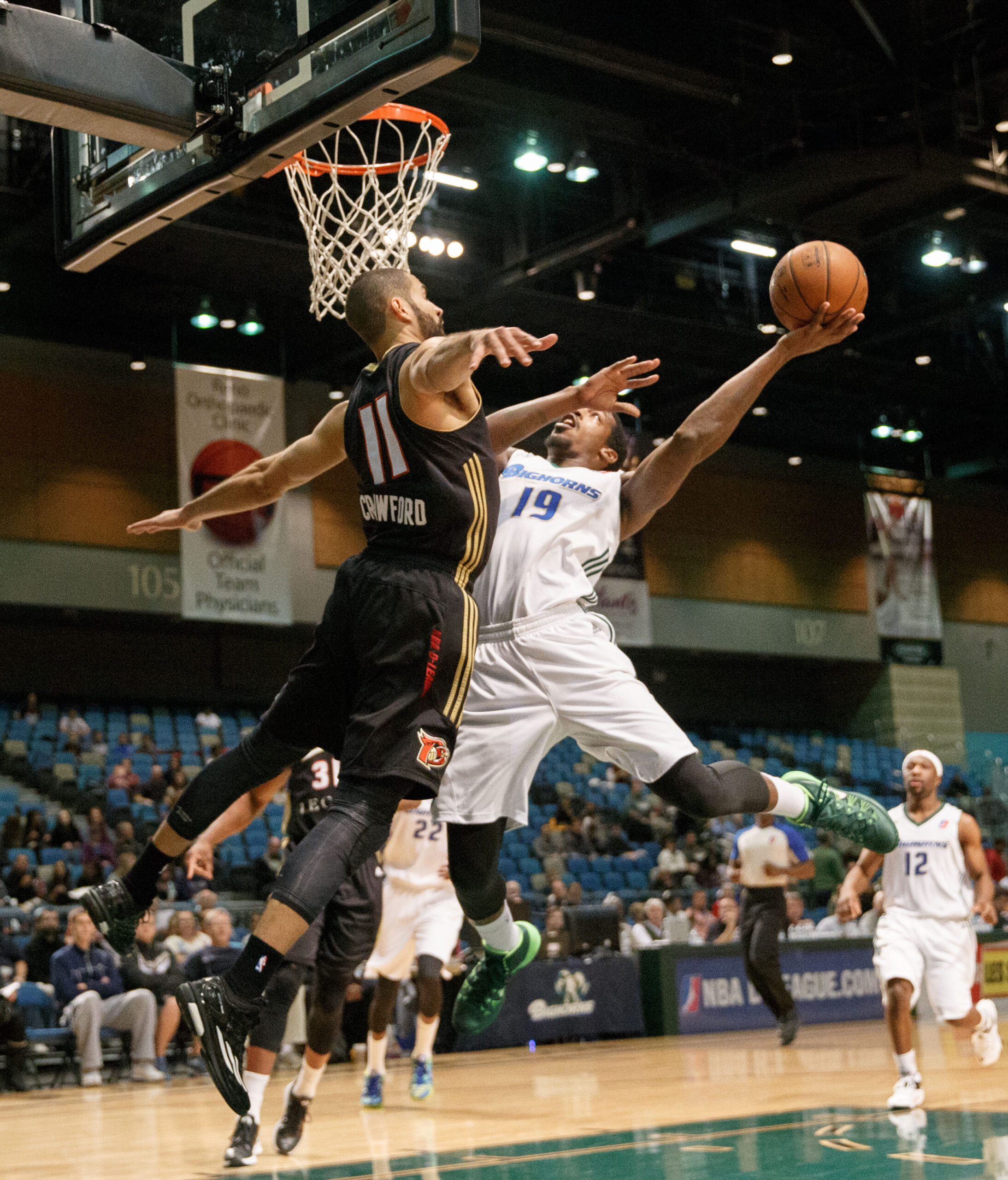 Dancing in the air, Reno Bighorn DURRELL SUMMERS (19) attempts to shoot agains Erie Bay Hawk DREW CRAWFORD (11) during the NBA D-League Basketball game between the Reno Bighorns and the Erie Bay Hawks at the Reno Events Center in Reno, Nevada.
