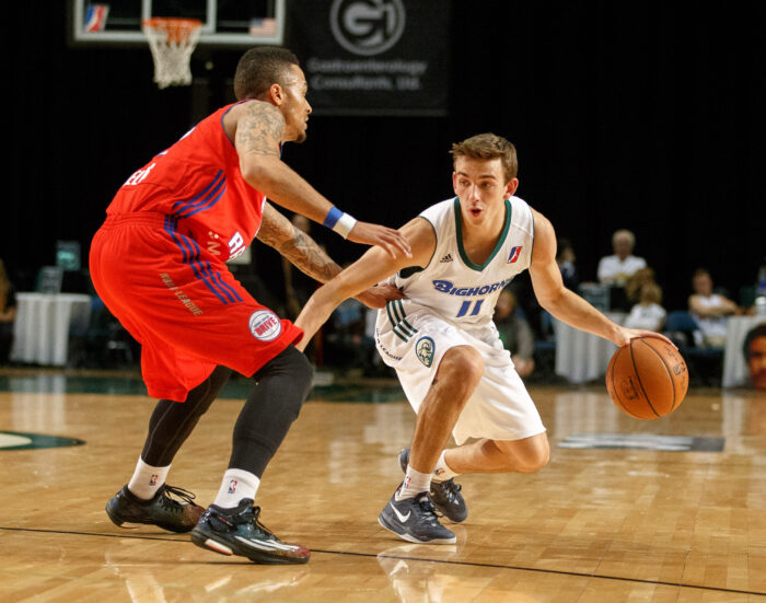 Reno Bighorn Guard DAVID STOCKTON (11) drives against Grand Rapids Drive defender BRANDON FIELDS (19) during the NBA D-League Basketball game between the Reno Bighorns and the Grand Rapids Drive at the Reno Events Center in Reno, Nevada.