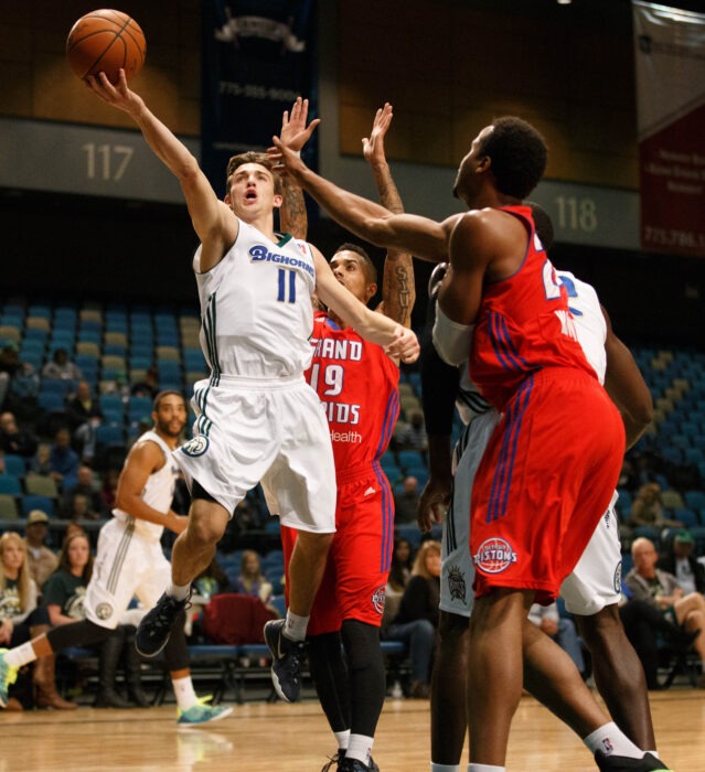 Reno Bighorn Guard DAVID STOCKTON (11) shoots during the NBA D-League Basketball game between the Reno Bighorns and the Grand Rapids Drive at the Reno Events Center in Reno, Nevada.