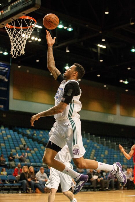 Reno Bighorn and Sacramento Kings assignee ERIC MORELAND (33) shoots during the NBA D-League Basketball game between the Reno Bighorns and the Grand Rapids Drive at the Reno Events Center in Reno, Nevada.