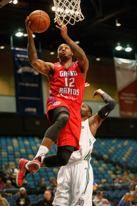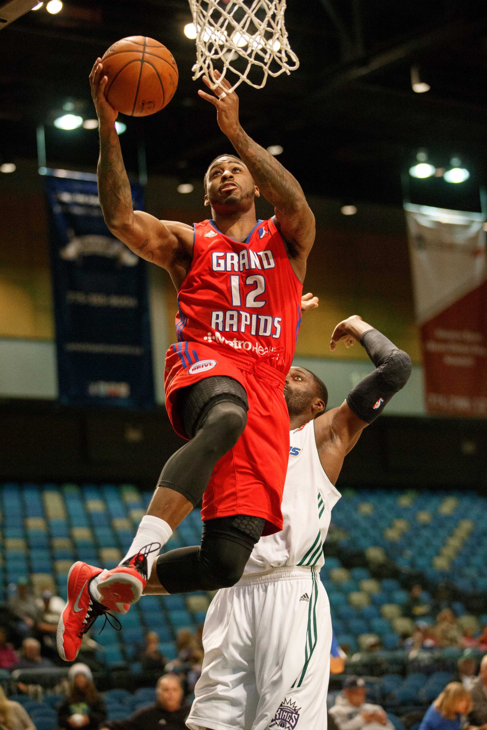 Grand Rapids Guard LD WILLIAMS (12) drives to the hoop during the NBA D-League Basketball game between the Reno Bighorns and the Grand Rapids Drive at the Reno Events Center in Reno, Nevada.