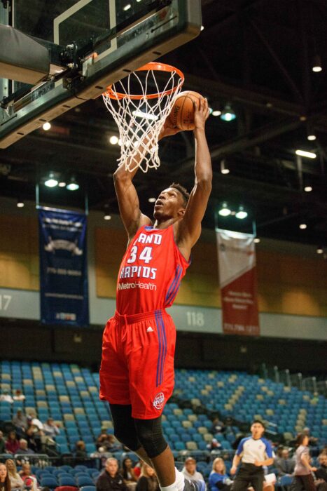 Grand Rapids Drive Center HASHEEM THABEET (34) dunks during the NBA D-League Basketball game between the Reno Bighorns and the Grand Rapids Drive at the Reno Events Center in Reno, Nevada.