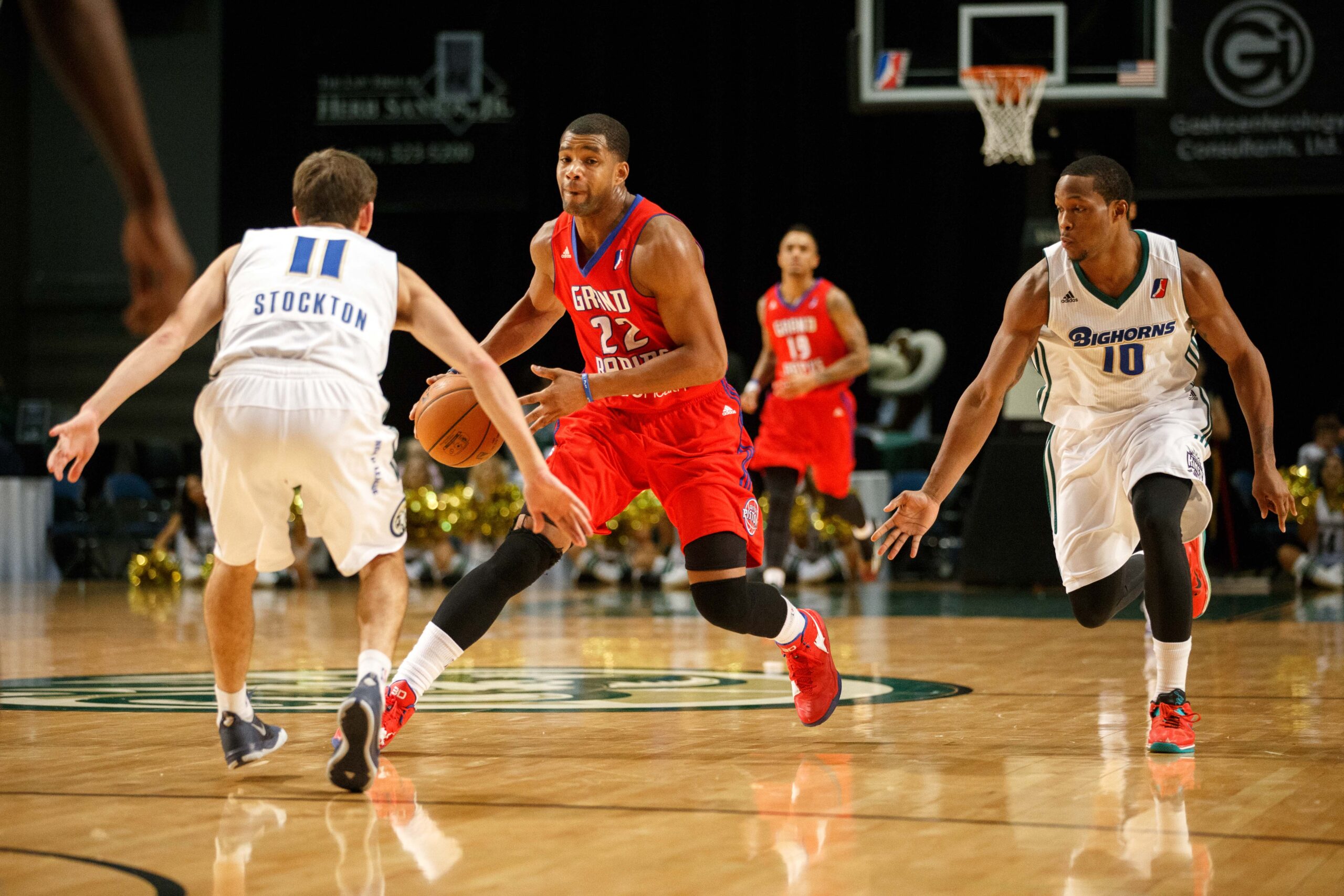 Grand Rapids Drive Forward JOSH BOSTIC (22) carries the ball up court while Reno Bighorn DAVID STOCKTON (11) and RAĆSHAD JAMES (10) defend during the NBA D-League Basketball game between the Reno Bighorns and the Grand Rapids Drive at the Reno Events Center in Reno, Nevada.