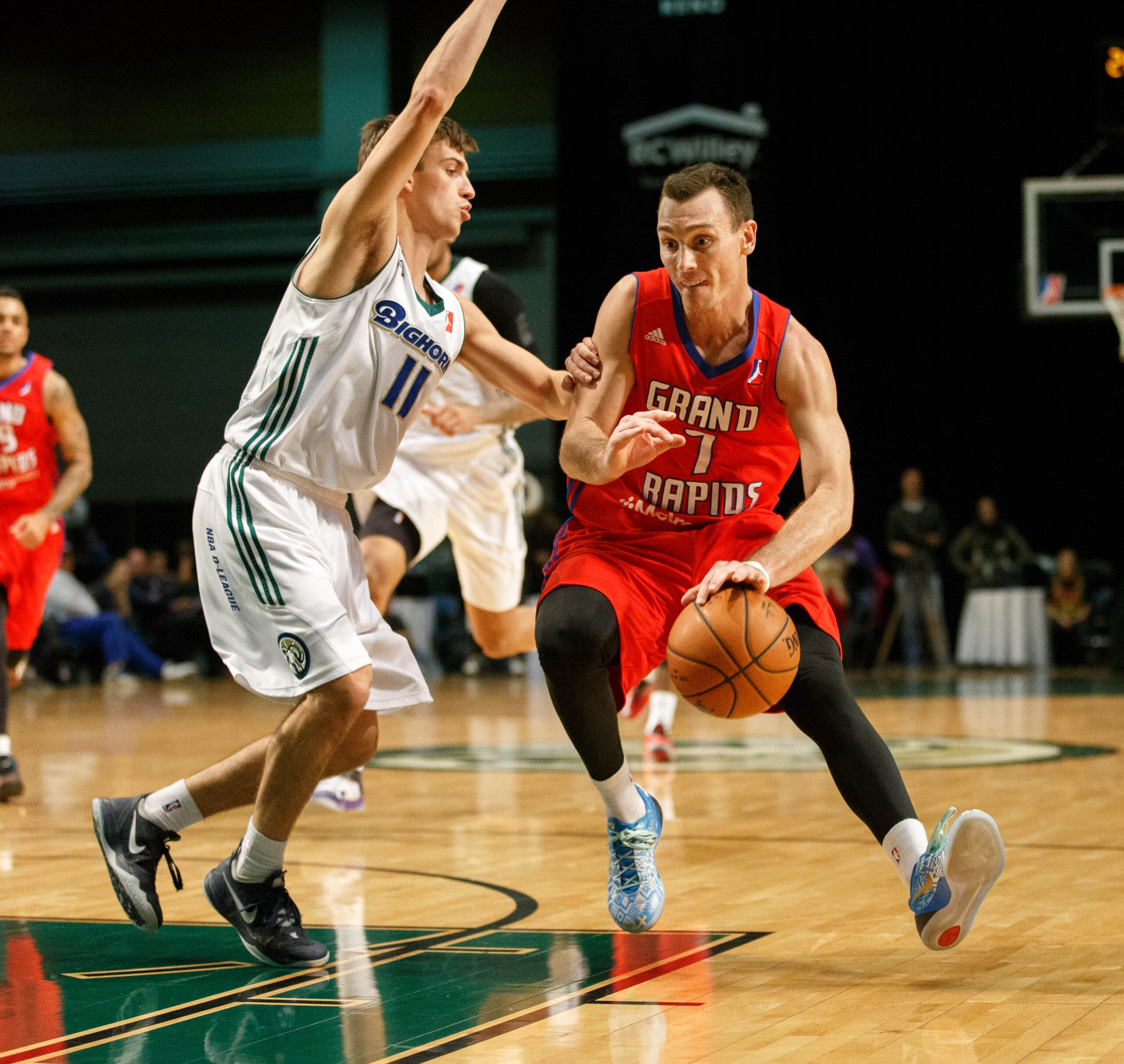 Grand Rapids Drive Guard BEN HANSBROUGH (7) drives against Reno Bighorn DAVID STOCKTON (11) during the NBA D-League Basketball game between the Reno Bighorns and the Grand Rapids Drive at the Reno Events Center in Reno, Nevada.