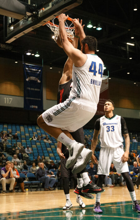 Reno Bighorn BIG MAN, 7 foot 5 inch Center SIM BHULLAR (44) throws down a monster dunk during the NBA D-League Basketball game between the Reno Bighorns and the Idaho Stampede Drive at the Reno Events Center in Reno, Nevada.