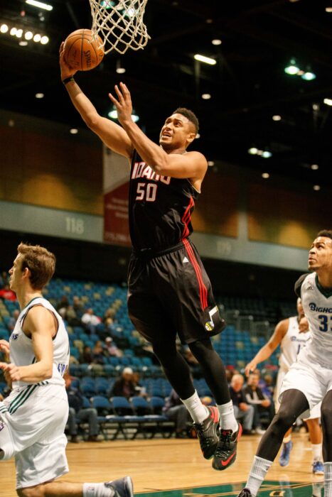 Idaho Stampede’s JERRELLE BENIMON (50) shoots a layup during the NBA D-League Basketball game between the Reno Bighorns and the Idaho Stampede Drive at the Reno Events Center in Reno, Nevada.