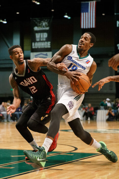 Reno Bighorn DURRELL SUMMERS (19) drives to the basket taking Idaho Stampede TRE BUSSEY’S (12) arm to the hoop during the NBA D-League Basketball game between the Reno Bighorns and the Idaho Stampede Drive at the Reno Events Center in Reno, Nevada.