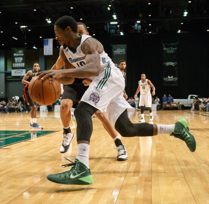 Reno Bighorn DURRELL SUMMERS (19) drives the baseline during the NBA D-League Basketball game between the Reno Bighorns and the Idaho Stampede Drive at the Reno Events Center in Reno, Nevada.
