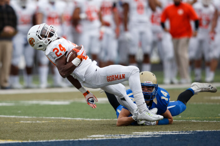 Bishop Gorman’s Russell Booze (24) stretches for a few more yards with Reed’s Ty Warkentin (14) holding tight during the NIAA State Championship Football game between the Bishop Gorman Gaels and the Reed Raiders at Damonte Ranch High School in Reno, Nevada.