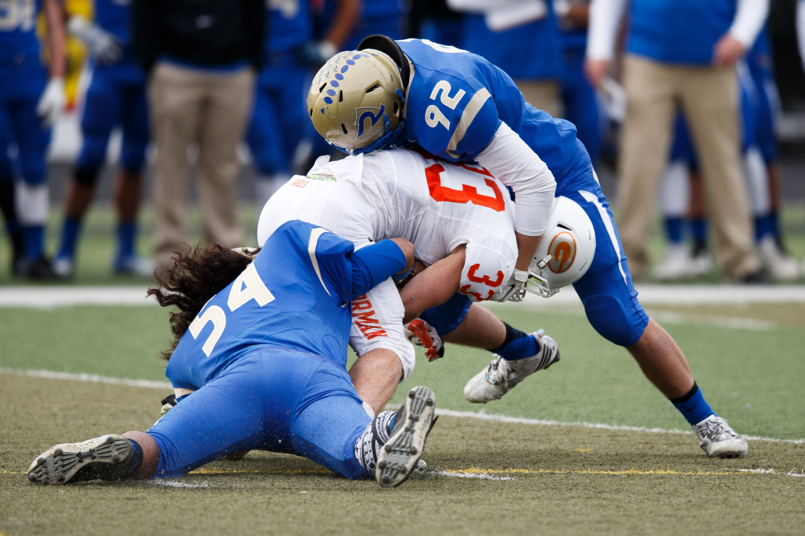 Reed defenders Daniel Mccarthy (92) and Sione Taukiuvea (54) stop Bishop Gorman runner Jonathan Shumaker (33) during the NIAA State Championship Football game between the Bishop Gorman Gaels and the Reed Raiders at Damonte Ranch High School in Reno, Nevada.