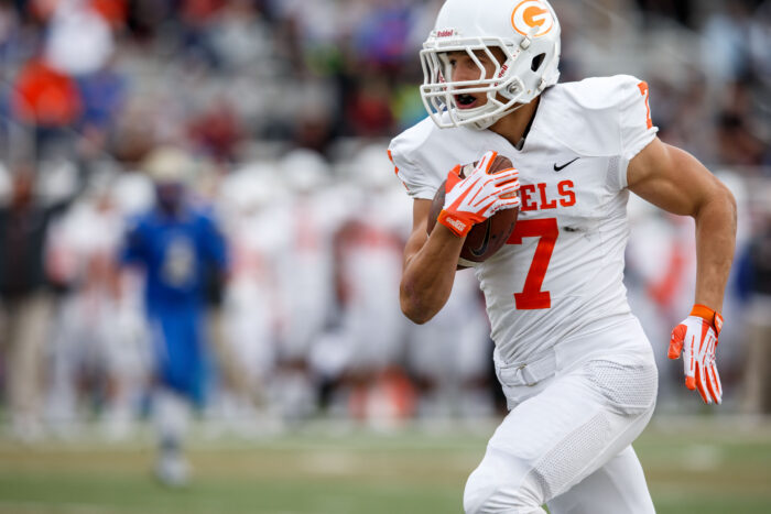Bishop Gorman’s Biaggio Walsh (7) on his way to the end zone for one of his touchdowns during the NIAA State Championship Football game between the Bishop Gorman Gaels and the Reed Raiders at Damonte Ranch High School in Reno, Nevada.
