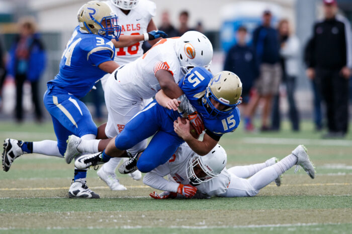Bishop Gorman defenders Farrell Hester (53) and Jabari Butler (20) tag team Reed Quarterback Matt Denn (15) during the NIAA State Championship Football game between the Bishop Gorman Gaels and the Reed Raiders at Damonte Ranch High School in Reno, Nevada.