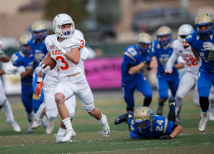 Bishop Gorman Brandon Gahagan (3) returns the opening kickoff deep into Reed territory during the NIAA State Championship Football game between the Bishop Gorman Gaels and the Reed Raiders at Damonte Ranch High School in Reno, Nevada.