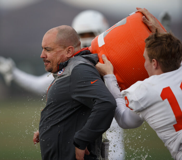 Bishop Gorman quarterback Tate Martell (18) gives Coach Tony Sanchez a Gatorade bath after the NIAA State Championship Football game between the Bishop Gorman Gaels and the Reed Raiders at Damonte Ranch High School in Reno, Nevada.