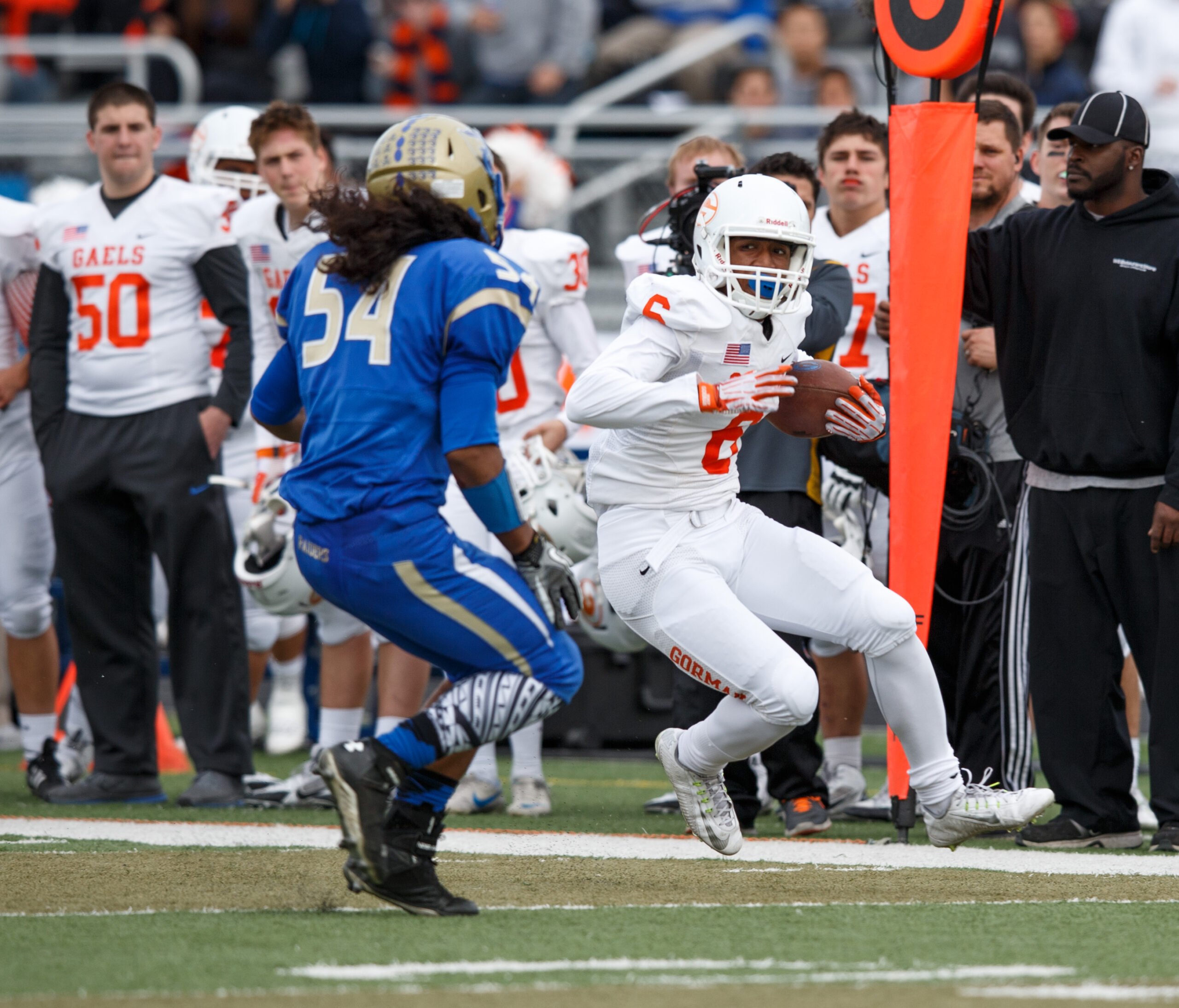 Bishop Gorman Austin Arnold (6) cuts back against Reed’s Sione Taukiuvea (54) on his way to the end zone during the NIAA State Championship Football game between the Bishop Gorman Gaels and the Reed Raiders at Damonte Ranch High School in Reno, Nevada.