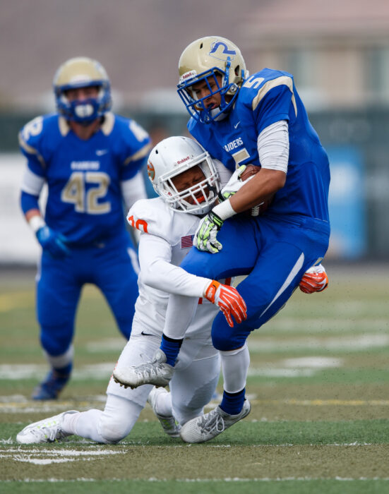Bishop Gorman defensive back Jabari Butler (20) stops Reed’s Alex Hernandez (5) during the NIAA State Championship Football game between the Bishop Gorman Gaels and the Reed Raiders at Damonte Ranch High School in Reno, Nevada.