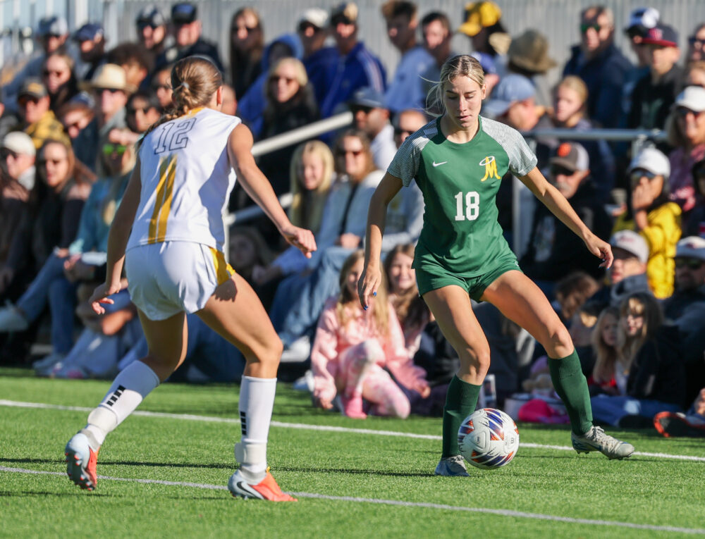 Bishop Manogue’s Reagan Swanson look assess her options against Galena’s Mckayla Amantia during the game between the Galena Grizzlies and the Bishop Manogue Miners, Bishop Manogue High School, Reno, NV
