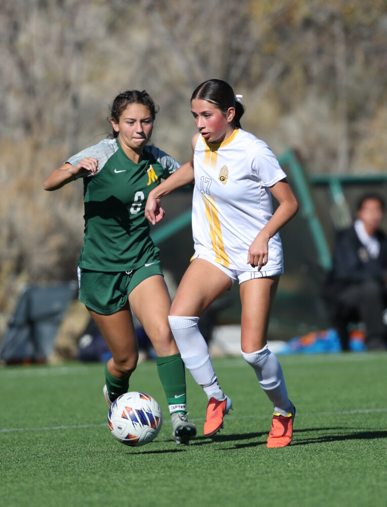 Galena’s Panda Ruvalcaba dribbles away from pressure from Bishop Manogue’s Natalia Alarcon during the game between the Galena Grizzlies and the Bishop Manogue Miners, Bishop Manogue High School, Reno, NV