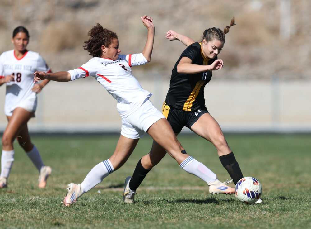 Doral Red Rock’s Jaya Roberts-Smith and Galena’s Alyssa Dixon stretch for possession of the ball during the NIAA State Championship game between the Doral Academy Red Rock Dragons and the Galena Grizzlies, Hug High School, Reno, NV