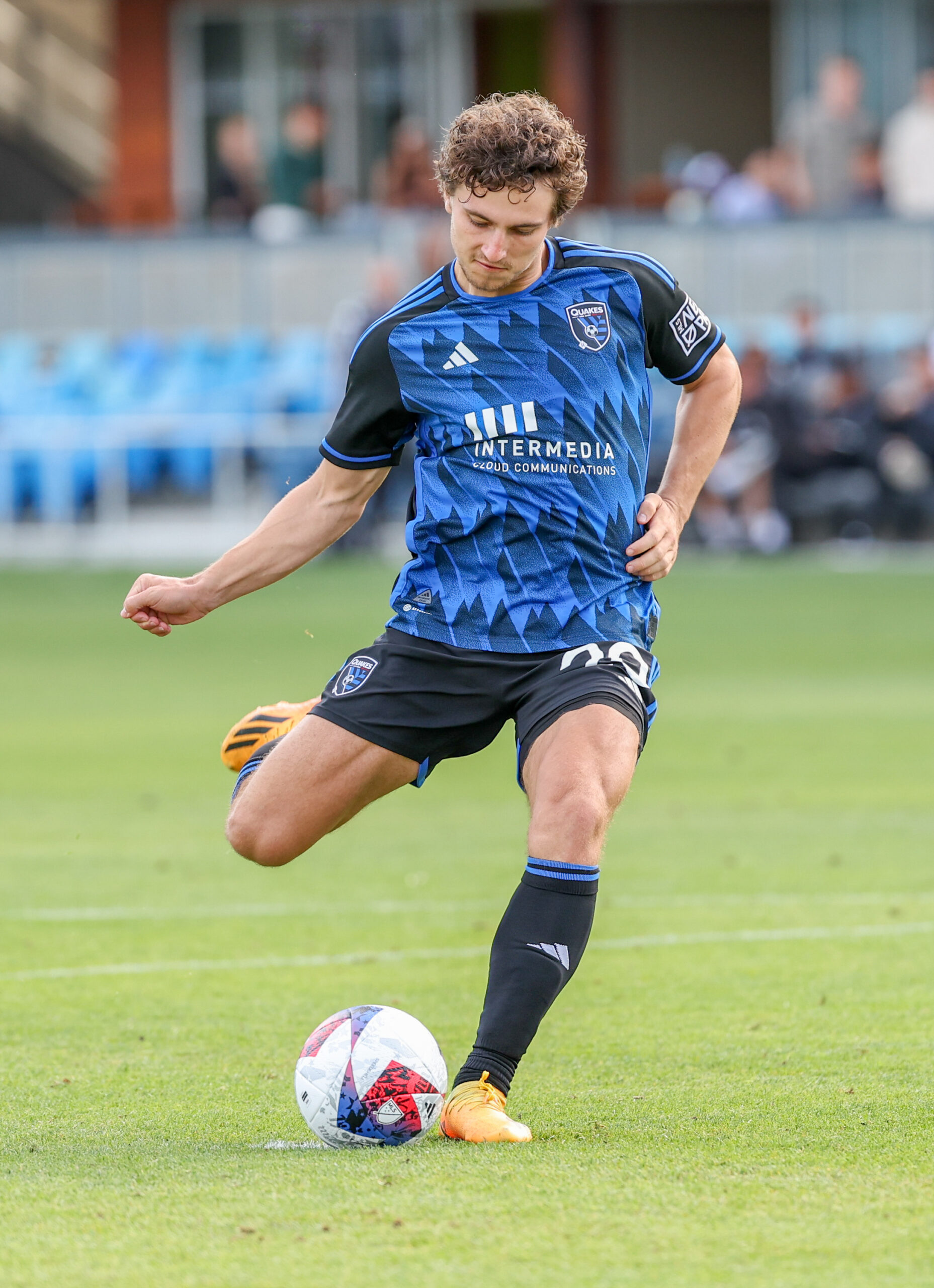 San Jose Earthquakes Midfielder WILL RICHMOND (20) shoots a penalty kick during the MLS Next Pro match between the San Jose Earthquakes II and the Tacoma Defiance at PayPal Park in San Jose, California
