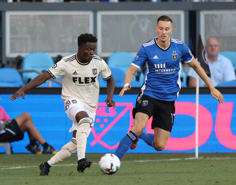 Los Angeles Football Club Forward KWADWO OPOKU (22) dribbles against San Jose Earthquakes Midfielder JÁN GREGUS (17) during the MLS match between the San Jose Earthquakes and the Los Angeles Football Club at PayPal Park in San Jose, California