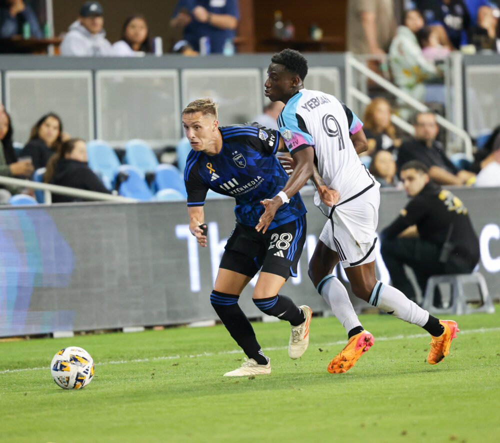 San Jose Earthquakes Forward BENJI KIKANOVIĆ (28) and Minnesota United Forward KELVIN YEBOAH (9) battle for the ball during the MLS match between the San Jose Earthquakes and Minnesota United at PayPal Park in San Jose, California