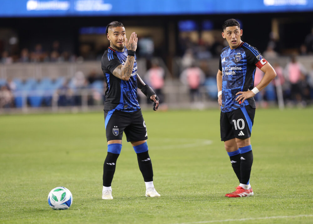 San Jose Earthquakes Forward CHICHO ARANGO (9) and San Jose Earthquakes Midfielder CRISTIAN ESPINOZA (10) setup to take a free kick at the top of the box during the MLS match between the San Jose Earthquakes and Minnesota United FC at PayPal Park in San Jose, California