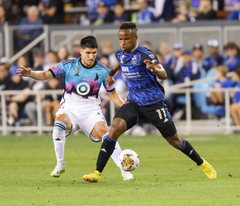 San Jose Earthquakes Forward JEREMY EBOBISSE (11) controls the ball with pressure from Minnesota United FC Defender MIGUEL TAPIAS (4) during the MLS match between the San Jose Earthquakes and Minnesota United at PayPal Park in San Jose, California