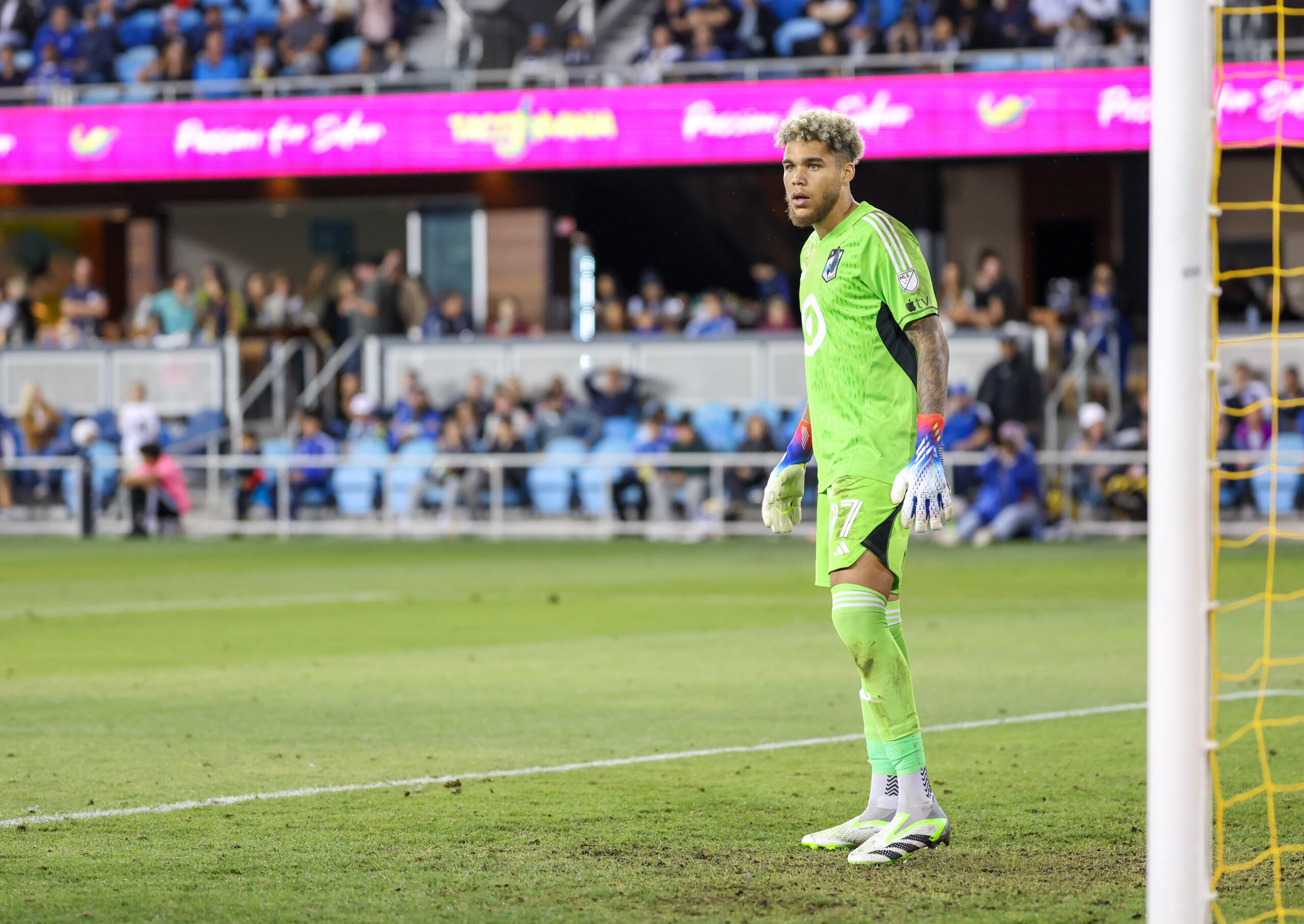 Minnesota United FC Goalkeeper DAYNE ST CLAIR (97) during the MLS match between the San Jose Earthquakes and Minnesota United at PayPal Park in San Jose, California