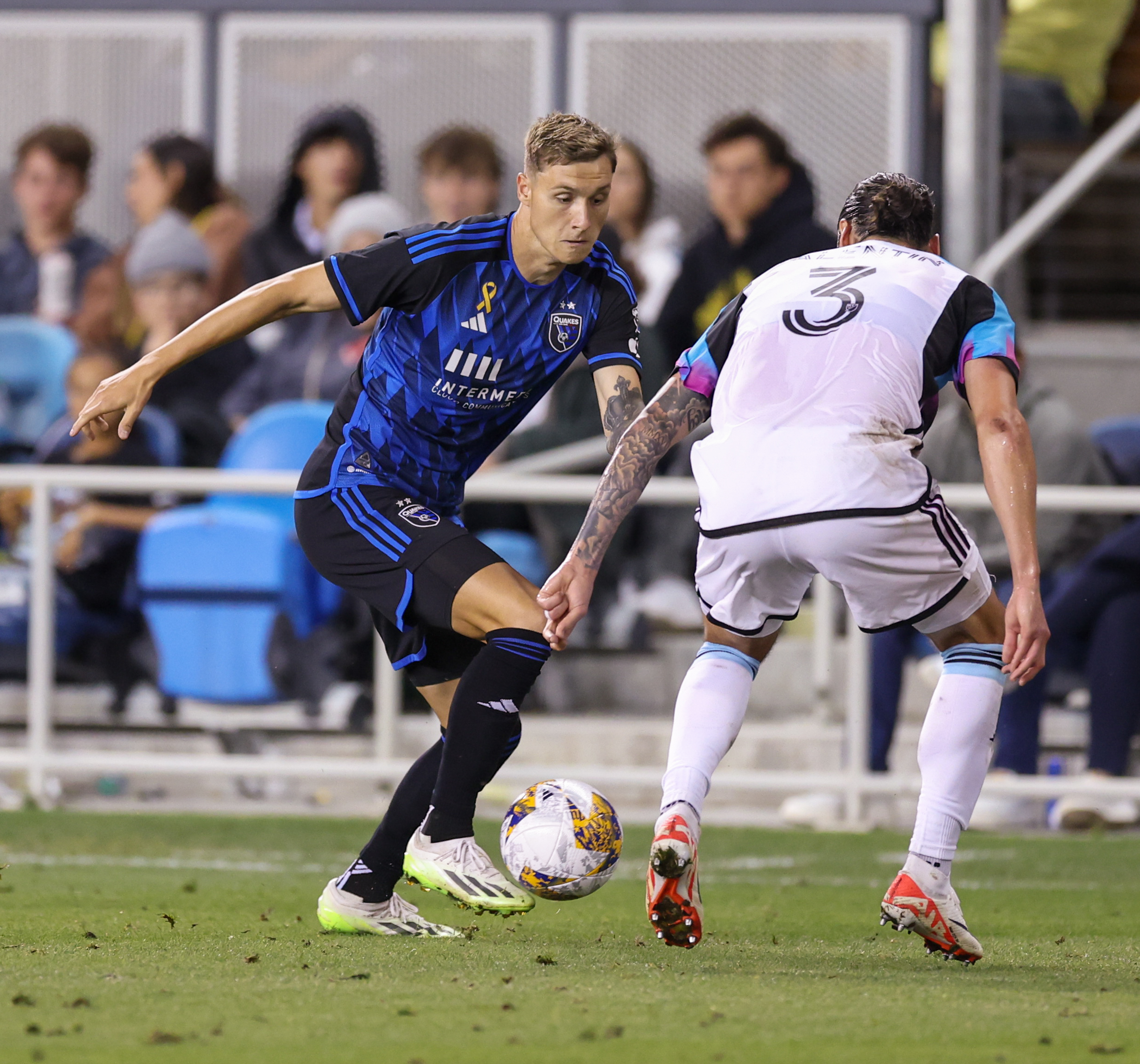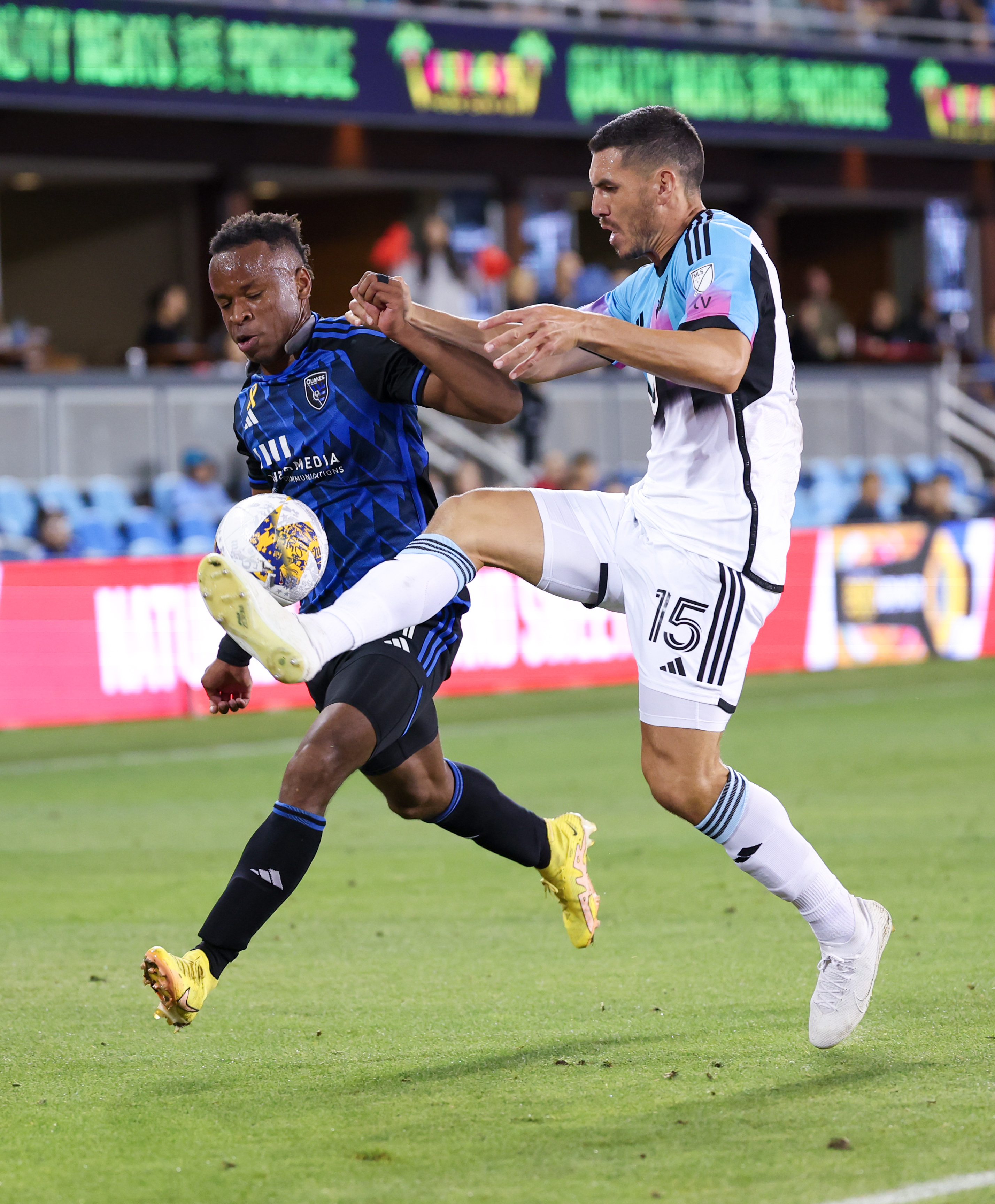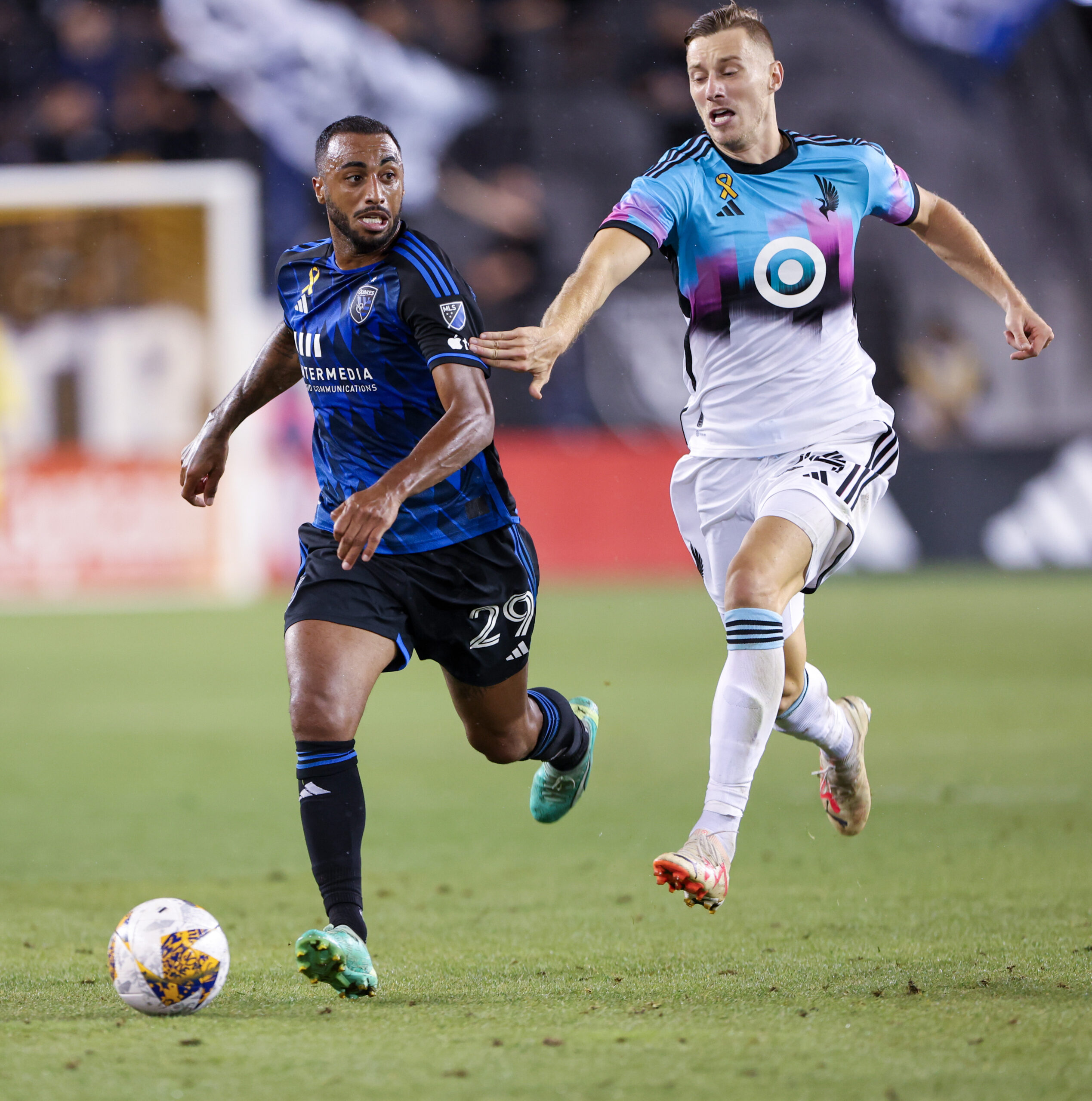 San Jose Earthquakes Defender CARLOS AKAPO (29) dribbles away from pressure from Minnesota United FC Midfielder JÁN GREGUS (24) during the MLS match between the San Jose Earthquakes and Minnesota United at PayPal Park in San Jose, California