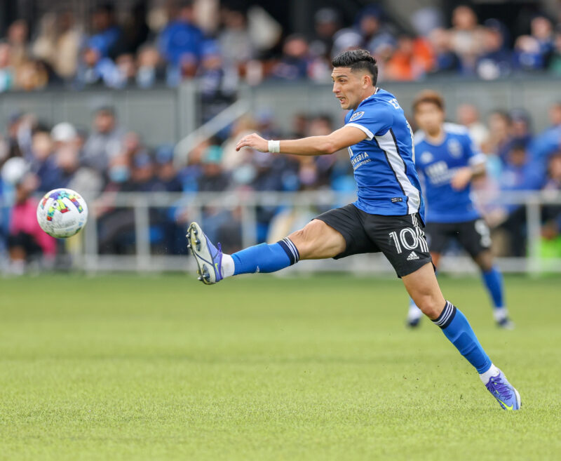 San Jose Earthquakes Midfielder CRISTIAN ESPINOZA (10) crosses the ball during the MLS match between the San Jose Earthquakes and New York Red Bulls at PayPal Park in San Jose, California